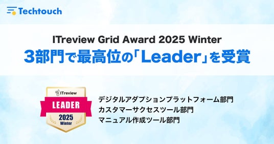 テックタッチ株式会社(本社:東京都港区、代表取締役 CEO:井無田 仲、以下 当社)が提供・開発する、デジタルアダプションプラットフォーム(DAP)国内シェア4年連続No.1の「テックタッチ」が、IT製品レビュープラットフォーム「ITreview」で発表された「ITreview Grid Award 2025 Winter」において、3部門で最高位である「Leader」を受賞したことをお知らせします。「デジタルアダプションプラットフォーム部門」と「マニュアル作成ツール部門」は、8期連続での受賞となります。