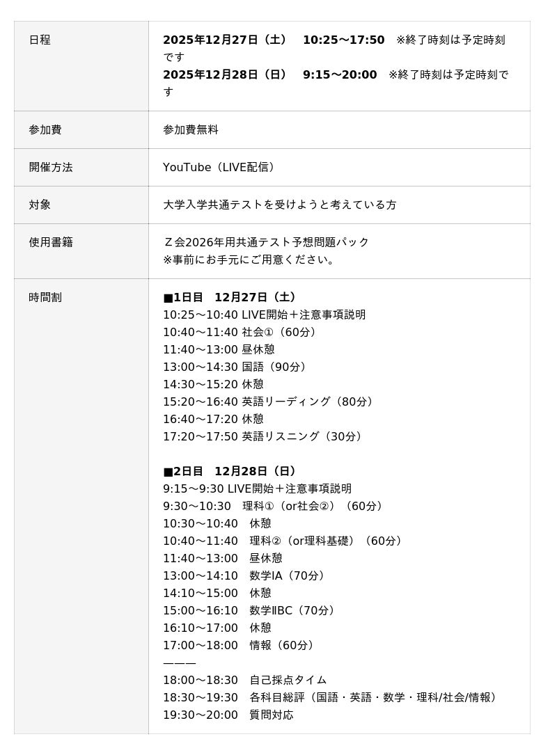 使用するのはZ会の「共通テスト予想問題パック」、参加媒体はYouTube LIVE動画なので、日本全国どこにいても参加可能で、参加費用は無料です。