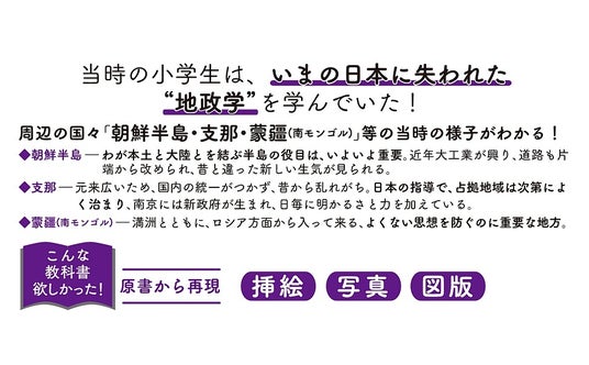 この地理教科書は、昭和十八年から終戦まで小学五、六年生用に使われた。本書は小学生に「地政学」という重要な概念を教養として植え付けようと編集の工夫がなされている。短い文章表現ではあっても適確に、簡潔明瞭に各地の地誌学的要点、その特質をえぐり出している。