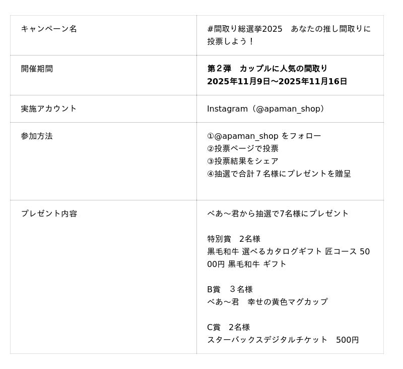 賃貸住宅仲介業店舗数No.1*のAPAMAN株式会社(東京都千代田区・EL CAMINO REAL株式会社の連結子会社代表取締役社長 山崎戒)は、公式Instagram(@apaman_shop)にて、フォロワー参加型キャンペーン「#間取り総選挙2025 あなたの推し間取りに投票しよう!」を、2025年11月9 日(日)より開催いたします。
