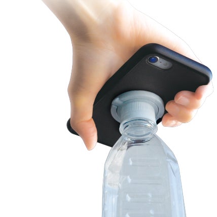 いつも持ち歩くスマートフォンを持ち手として、PETボトルキャップを軽い力で開けられます。
