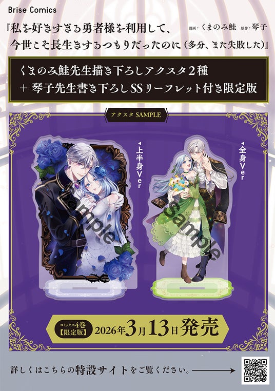 キルタイムコミュニケーションは、ブリーゼコミックス『私を好きすぎる勇者様を利用して、今世こそ長生きするつもりだったのに(多分、また失敗した)4』『私を好きすぎる勇者様を利用して、今世こそ長生きするつもりだったのに(多分、また失敗した)4 アクリルスタンド2種+SSリーフレット付き限定版』を3月13日に発売いたします。