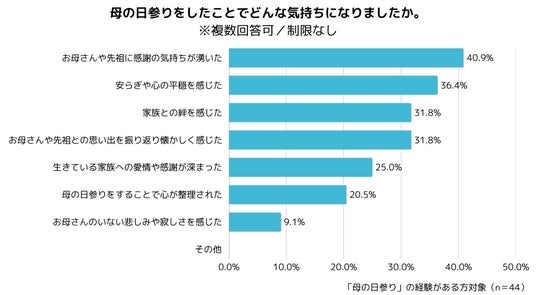 - 「母の日参り」実施者からは「母や先祖に感謝の気持ちがわいた」(40.9%)、「安らぎや心の平穏を感じた」(36.4%)との声。