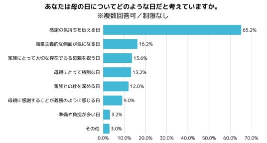 母の日はどのような日かと尋ねると「感謝の気持ちを伝える日」が65.2%で最も多く、「商業主義的な側面が気になる日」が16.2%、「家族にとって大切な存在である母を祝う日」13.6%と続きました。この結果から、商業的な側面を少なからず意識しつつも、多くの人々が母の日を感謝と祝福の機会として前向きに捉えていることがうかがえました。