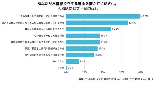 - 「数年に1回程度以上お墓参りをする」という方にうかがった、その主な理由としては「年中行事として毎年行っている習慣だから」(40.0%)、「故人との繋がりを感じられる大切な時間だと感じているから」(33.4%)が上位に。また、「墓地や仏壇の手入れや掃除をするため」という実務的な回答は若い世代にいくほど減少する傾向にありました。