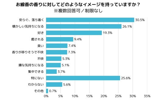 - お線香の香りに対しては、すべての年代で「懐かしい気持ちになる」「安らぐ、落ち着く」というポジティブなイメージが上位を占めました(※「特にない」の回答を除く)。お線香の香りが持つ心理的効果は世代を超えて共通しており、現代人のストレス社会における「安らぎ」の提供という新たな価値も見出せます。