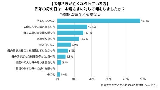 - 母親と死別している方でも、昨年の母の日には「何もしていない」(48.4%) という回答が半数近くを占め、次いで「仏壇に花やお供え物をした」(17.5%)、「母との思い出を振り返った」(15.1%)、「お墓参りをした」(12.7%)という結果となりました。現代社会では母の日の認知度は高いものの、特別な日として何か行動する人は半数ほどのようです。特に母親と死別している方々にとっては、故人を偲ぶ具体的な方法が確立されていないことが浮き彫りになりました。
