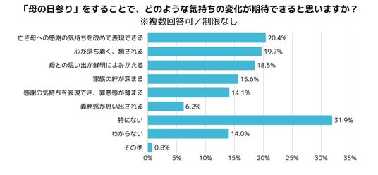 - 「母の日参り」をすることよって期待できる変化としては、「亡き母への感謝の気持ちを改めて表現できる」(20.4%)、「心が落ち着く、癒される」(19.7%)、という回答が多く見られました。