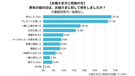 1. 母の日に「何もしない」が最多。20代の半数以上が「しなかった・できなかった場合」罪悪感を抱く- 母親がご存命の方々に伺った昨年の母の日の過ごし方では、「何もしていない」(33.1%)が最多となり、「プレゼントを渡した」(31.5%)、「一緒にご飯を食べた」(18.1%)と続きました。