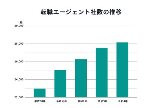 近年、転職市場は活況を呈しており、転職エージェントの数は、令和4年には前年比122%増の約28,000社に増加しました。(※1)