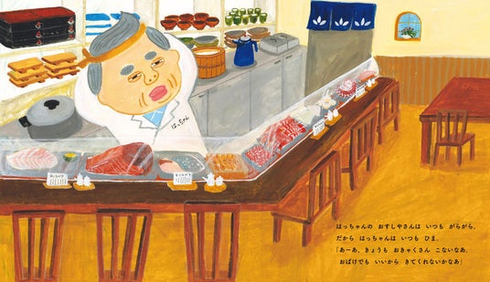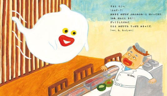 いつもガラガラでヒマな、はっちゃんのおすしやさん。「おばけでもいいから来てくれないかなあ」と、はっちゃんがつぶやくと本当におばけがやって来た! おばけにお寿司を握ってあげると、おばけは大喜び。お礼におばけの魚を釣ってきたけど、食べられるのかなあ?
