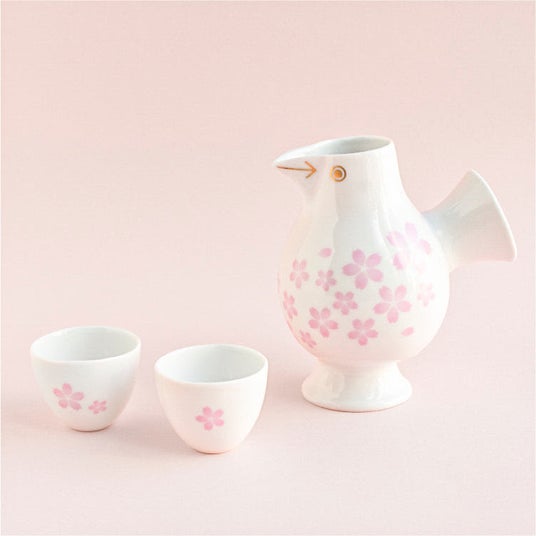 リサのアトリエに飾ってあった鳥の形の水差しが原型となり生まれた波佐見焼の「おさけとり」。卵を割った形をイメージした小さなお猪口は、それぞれデザインが違うところもポイントです。ピンクの化粧箱入りなので贈り物にもおすすめ。