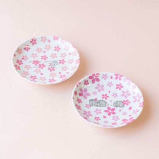 桜模様の春らしい姿におきがえしたマイキーと、満開に咲き誇る桜の中でばったり出会うはりねずみたちの様子がデザインされた豆皿。2枚の桜模様や色が少し異なるところもポイントです。つるんと丸い縁が全体をさらに優しい印象にしています。