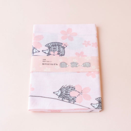 桜の咲き誇る中、お散歩を楽しむはりねずみのてぬぐいです。淡いピンクはやさしげな和のテイストを際立たせ、華やかな雰囲気。キッチンタオルやクロスとしてお使いいただけるのはもちろん、専用の額に入れてディスプレイするのもおすすめです。