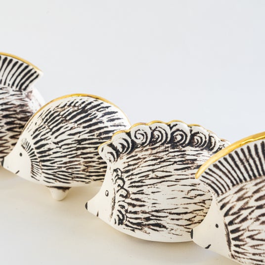 2019年頃、リサの福袋を作ることになり、そこでなにかとっても嬉しい大当たりを入れたいということで、金のはりねずみを作りました。これはサンプルを含めても数個ずつしか作っておらず、トンカチの社内にも1セットしか現存しないくらい、正真正銘のレア中のレアなアイテムです。大当たりとしてごく少数のみ世に出ただけの、幻のはりねずみですが、リサの追悼展(2024年4月にギャラリー「のこぎり」にて開催)にて久々に公開してみたところ、あまりに反響が大きく、また私たちにとっても、リサの天才を目の当たりにした思い出の作品でもあることから、もういちど、そして今度はもう少し多くの人に届けたく、当時を知るスウェーデンの工房の協力を得て、限定的に復刻することとなりました。