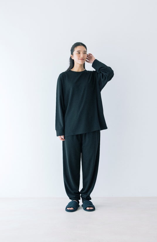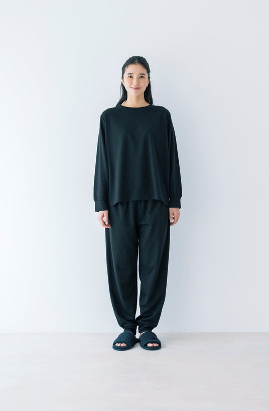 サラリとした肌触りに加えて、足首に向かってやや絞られたシルエット。裾まわりにゴムなどは入っていないため、窮屈に感じる締めつけ感がなくラクに着られます。