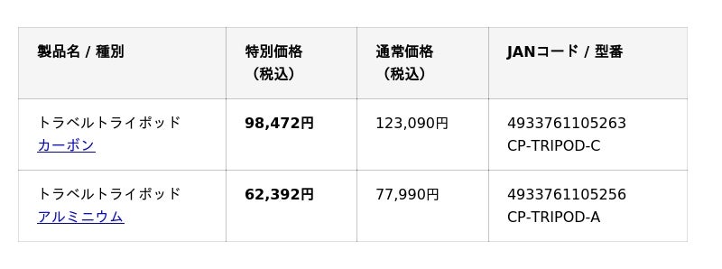 この度、2026年4月29日(水)~6月15日(月)までの間、この「トラベルトライポッド(カーボン/アルミ)」を“20%OFF”の特別価格でご提供する、期間限定セール「TRAVEL TRIPOD EARLY SUMMER SALE」を開催いたします。