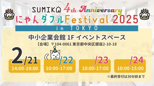 株式会社TIRAMISU(本社:東京都世田谷区 代表取締役:高澤 匡 以下「当社」)が運営する 猫ぐらしブランド「キミとワタシのSUMIKA」は2025年2月21日から2月24日の4日間に渡り「東京都中小企業会館」1Fイベントスペース(東京都中央区銀座2-10-18)にて、ブランド生誕4周年記念イベント、SUMIKA 4th Anniversary『にゃんダフルFestival 2025 in TOKYO』を開催いたします。