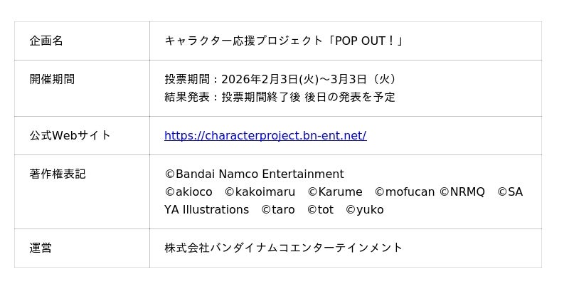 株式会社バンダイナムコエンターテインメント(以下、当社)は、本日2月3日(火)~3月3日(火)まで、LINEスタンプで活躍するクリエイター・キャラクターを対象としたユーザー投票型キャラクター応援プロジェクト「POP OUT!(ポップアウト!)」を開催いたします。