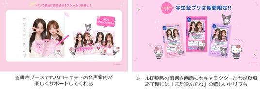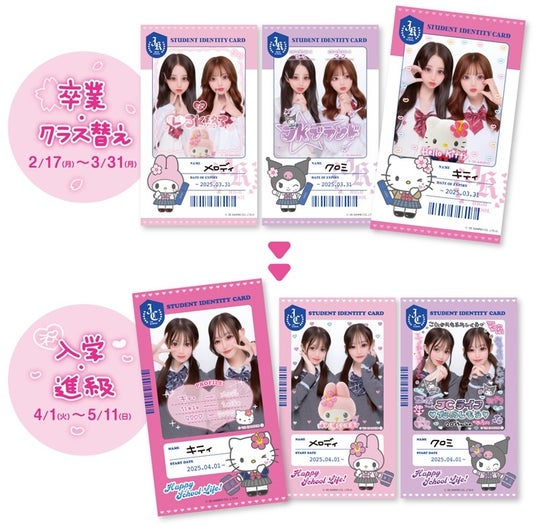 本コラボでは、春の卒業・入学シーズンに合わせてデザイン・演出が切り替わることや、JC・JKでデザインを選べることが特徴です。卒業・クラス替えデザインは2月17日(月)から3月31日(月)まで、入学・クラス替えデザインは4月1日(火)から5月11日(日)まで。シールや撮影フレームのデザインが切り替わることはもちろん、ハローキティによる音声案内やキャラクターたちの画面演出も切り替わります。JCからJKへの進学時など変化のタイミングに合わせて学生証プリを撮り比べてみれば、キラキラした学生ライフをより一層お楽しみいただくことも。
