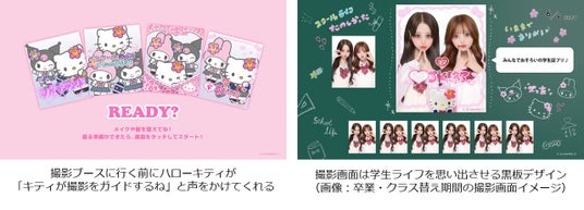 ハローキティによる音声案内が「プリコラボモード」の選択から落書き画面のエンディングまで、プリ体験を盛り上げてくれます。撮影ブースでは、「3、2、1」のカウントダウンはもちろん、「最高に盛れてる♪」、「青春の思い出残しちゃおう♪」、「今しかないスクールライフ、楽しんでね♪」、「これからもずーっとお友達♪」などのセリフを収録。また、BGMには卒業・入学をテーマにした有名ソングのカバー曲を搭載しており、撮影時間がより特別感のある雰囲気に。落書きブースの音声案内にもハローキティが登場し、落書き画面でのかわいいデコレーション方法を楽しくサポートしてくれます。