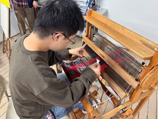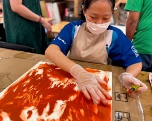 古布を裂いて横糸として織り込む手法を用いながら、studioFLATのパラアーティストが自由な感性で織り上げ、反物を制作します。絵画については廃棄化粧品を一部用いて制作しています。