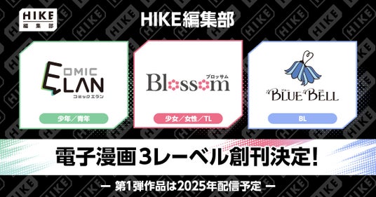 株式会社HIKE(本社:東京都新宿区、代表:三上 政高、以下「HIKE」)の電子漫画出版事業を担う「HIKE編集部」は、3つの漫画レーベルを創刊いたします。創刊するのは少年/青年向け作品の「COMIC ELAN」(コミックエラン)、少女/女性/TL作品の「Blossom」(ブロッサム)、「BL」作品を取り扱う「BLUE BELL」(ブルーベル)です。各レーベルの第一弾作品は2025年中の配信を目標に制作を進めています。また、プロ・アマを問わない方々が自主制作した作品を発表・販売する展示即売会「九州コミティア9」(日程:2025年3月2日、会場:西日本総合展示場 新館)の「出張マンガ編集部」にHIKE編集部が出展することもあわせてお知らせします。