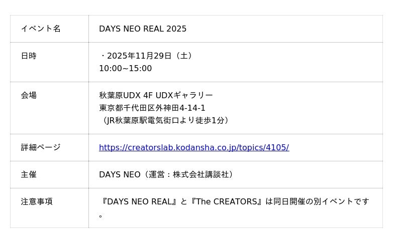 株式会社HIKE(本社:東京都新宿区、代表:三上 政高、以下「HIKE」)の電子漫画出版事業を担う「HIKE編集部」は、合同出張編集“者”マンガ持ち込み会『DAYS NEO REAL 2025』(日程:2025年11月29日、会場:秋葉原UDX 4F UDXギャラリー)に出展いたします。イベント当日は、みなさまの作品をお待ちしております。