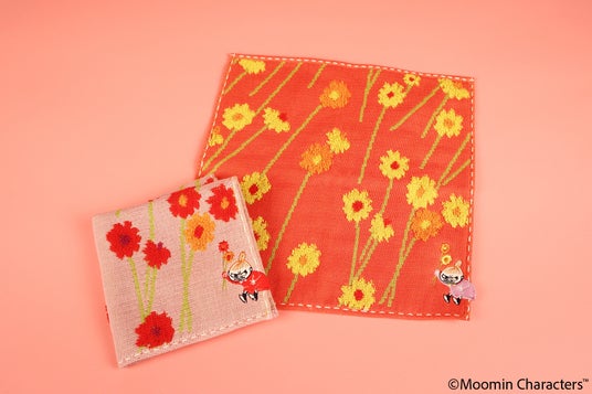 ミニタオル お花摘み リトルミイお花が全体にあしらわれたミニタオル。花びら部分はパイル地で仕上げられており、立体感があるデザインが特徴です。タオルをぐるりと囲うようなステッチと、タオルから少し飛び出したリトルミイもポイントです。