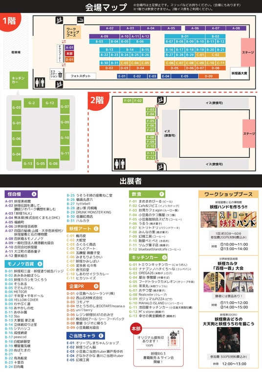怪自慢パビリオン(妖怪をテーマに全国各地で活動する団体、施設)|モノノケ百貨パビリオン(物販)|妖怪アートパビリオン(アート作品)|企業・商品PRパビリオン(企業・観光)|ご当地キャラパビリオン|キッチンカー・飲食パビリオン、6つにカテゴライズされたパビリオンに多彩なブースが集合。全国各地から出店が揃い、ワークショップブースではカルタ大会なども開かれファミリーでも楽しめるコンテンなっています。