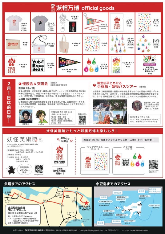 香川県・小豆島の「迷路のまち」(土庄本町)の妖怪美術館(小豆島ヘルシーランド株式会社)は、「妖怪」をテーマにあらゆる妖怪文化を育む人々が集い世界に向けて妖怪文化を発信するビッグイベント「妖怪万博2025」を開催。これを機に、妖怪美術館の入館チケットに「妖怪万博2025」オフィシャルグッズ(クリアファイル+ステッカー)がついてくるプランを新たに加えました。