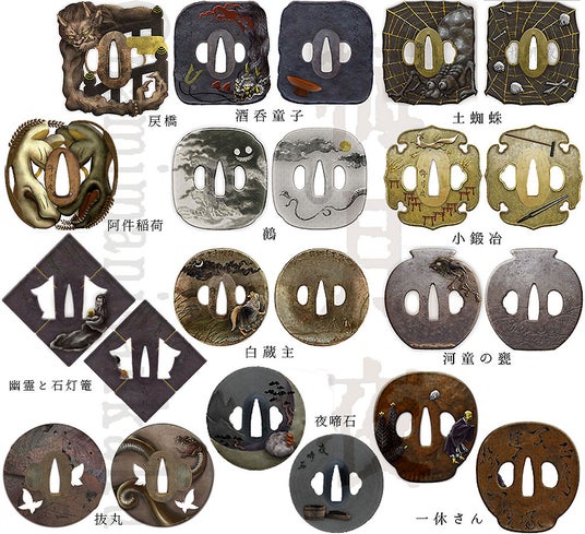 【梅月夜】(うめつきよ)愛知出身の妖怪書画家 蘭陵亭子梅(怪作戦)と京都の時代劇和装スタイリスト梅只さつきの夫婦ユニット。帯留めにもなる身に着けられるアクリルキーホルダー。妖の鍔アクリルキーホルダー 各1,760円など
