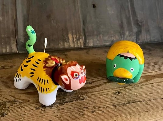 【シマハリコ】ゆるい顔の妖怪を張り子で作っています。[首振り鵺]お尻に刺さった矢がこだわりのマニアックポイント[首振り河童]首を振っても大好物のキュウリは離しません首振り鵺 2,860円、首振り河童 2,640円など