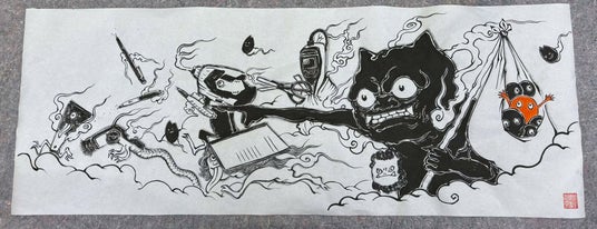 1月8日にハンズ新宿店にて柳生忠平によるライブペイントを実施し「ハンズで販売している商品にとりつく妖怪」をテーマに描き上げた作品は会期中、新宿店・梅田店それぞれに展示されます。