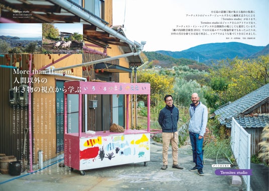 小豆島の素麺工場が集まる池田の集落にある「Termites studio」は、アーテイストのジャック・ジェームズさんと越後正志さんのアトリエであり、アーティスト・イン・レジデンスや公開制作の場。「瀬戸内国際芸術祭2013」に参加したふたりは10年の月日を経て小豆島で再会。アート活動を続けている。