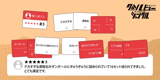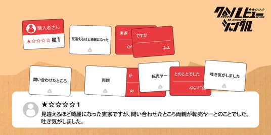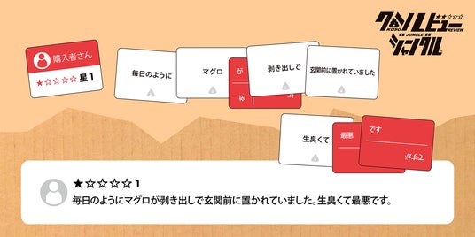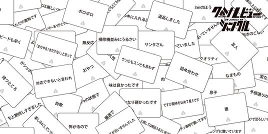 『クソレビュージャングル』は、ネット上にあふれる理不尽なレビューや信ぴょう性のない口コミを、プレイヤーのユーモアとセンスで作り上げるカードゲームです。