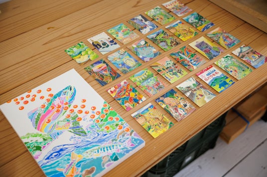 今回のイベントで提供するサーモンや養魚場をモチーフにホテルオリジナル4種類のトリップカードをデザインしていただきました。アーティスト 朝倉氏の代表作品でもあるトリップカードは、大山とその周辺の名所・グルメ・お土産や観光スポットなどを、オリジナルのアートワークで紹介する観光案内カードです。裏面に各トピックの情報があり、QRコードを読み取ると詳しい紹介を読むことができます。カードから行きたい場所を探したり、訪れた場所を振り返ったり、旅の思い出に最適なアーティスティックなカードです。