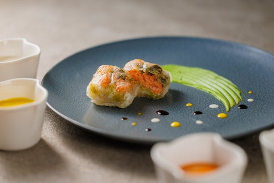 境港の沖合、冬の日本海の荒波と流れの速い潮流が、運動量豊富で身の締まった境港サーモンを育みます。身に弾力があり、脂がのりすぎず、さっぱりとした上品な味わいが特徴です。この境港サーモンを、アボカド・トマト・玉ねぎ、砂丘らっきょうと一緒に生春巻きで包んで揚げました。外はカリっと、中はしっとりとしています。粗めにカットされた砂丘らっきょうのしゃきしゃきとした食感がアクセントの一品です。