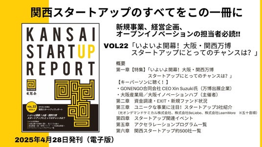 NPO法人生態会(所在地:大阪市北区、理事長:アレン・マイナー)は、関西のスタートアップに特化した情報を提供する「関西スタートアップレポートvol.22」を2025年4月末に発刊します。