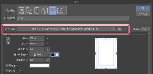 それに合わせて、これまで「CLIP STUDIO PAINT」にプリセットしていた集英社専用原稿形式をリニューアルし、新たなプリセットとして「集英社マンガ誌汎用(少年誌・少女紙・青年誌共通/新書・B6判単行本化)」を実装しました。