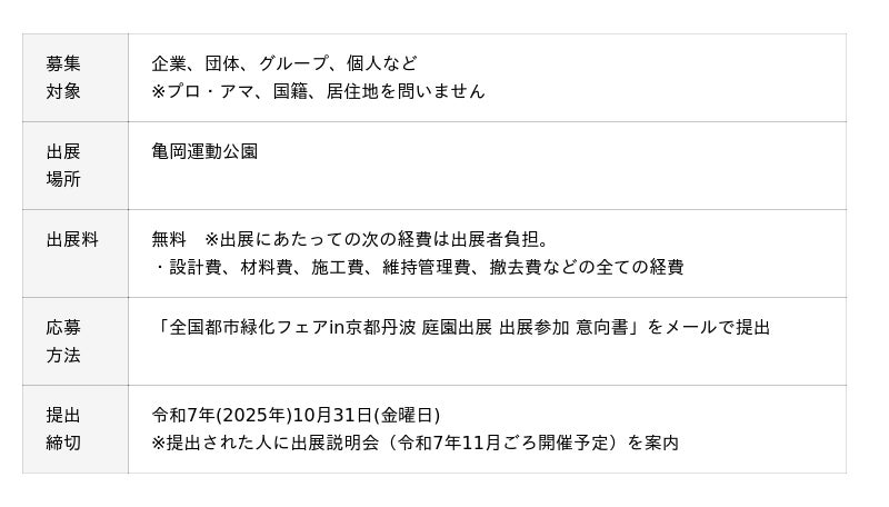 第43回全国都市緑化フェアin京都丹波実行委員会(会長:桂川 孝裕・亀岡市長)は、令和8年(2026年)秋に開催する「第43回全国都市緑化フェアin京都丹波」(以下、本フェア)の中核事業として、拠点会場の1つである亀岡運動公園を彩る庭園コンテストの作品を募集します。