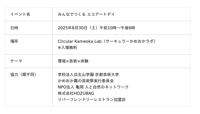 本イベントは、地域の多様な団体(京都芸術大学、かめおか霧の芸術祭実行委員会、NPO法人 亀岡 人と自然のネットワーク、株式会社HOZUBAG、リバーフレンドリーレストラン加盟店)と連携し、ユニークな取り組みを実施します。
