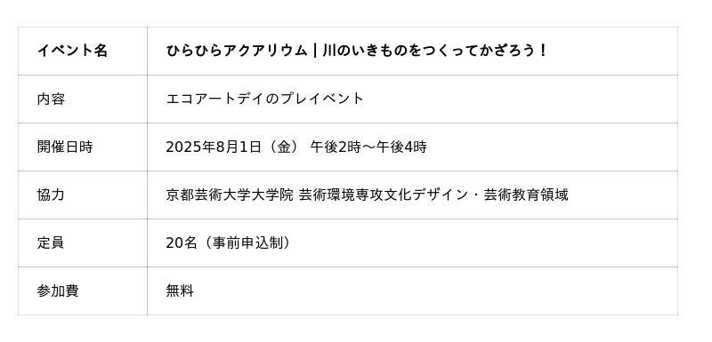 「みんなでつくるエコアートデイ」のプレイベントとして、「ひらひらアクアリウム|川のいきものをつくってかざろう!」を開催します 。Circular Kameoka Labの壁面が、子どもたちの手で「ひらひらアクアリウム」に大変身。HOZUBAGの切れ端などを活用したワークショップで、想像の生き物などを含め、泳ぐ生き物を制作するワークショップです。施設の壁面を、ゆらゆら、すいすい泳ぐいきものたちでいっぱいにします。
