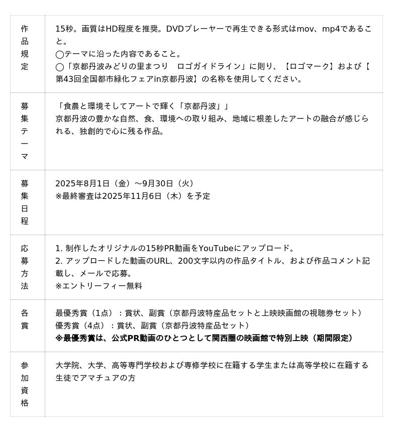 - 瑞々しい感性、自由な発想をもとに京都丹波の緑化フェアへの興味関心を引くような魅力を15秒に凝縮すること。