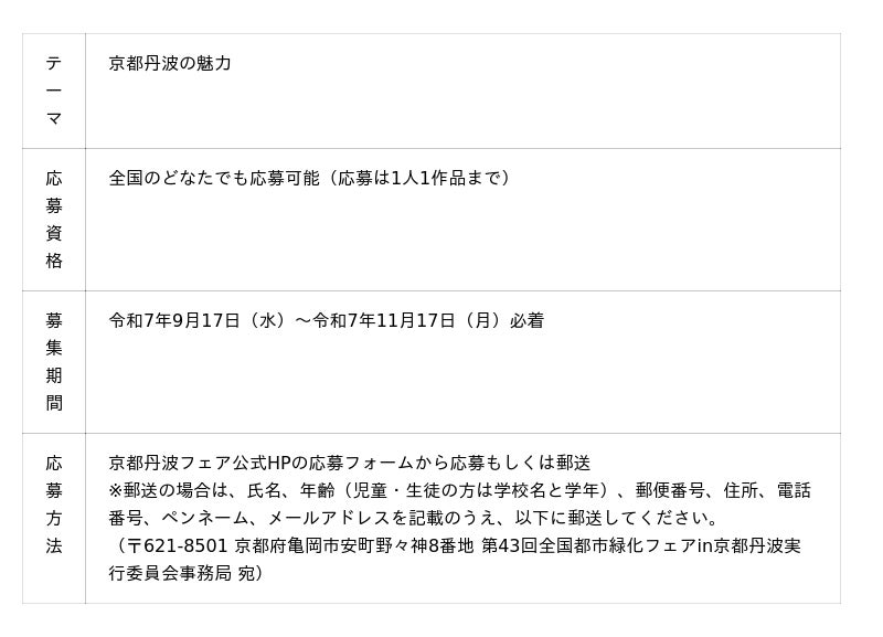 2026年秋に、日本最大の緑のイベント「第43回全国都市緑化フェアin京都丹波」が、京都丹波地域(亀岡市、南丹市、京丹波町)を会場として開催されます。このフェアは、「食農と環境そしてアートで輝く『京都丹波』」をテーマに、豊かな自然や文化の魅力を共有し、こころ豊かなライフスタイルを育むことを目的としています。この企画は、単にフェアの機運を高める手段に留まらず、一人ひとりが地域の魅力を改めて見つめ直し、自分自身の言葉で表現する「参加型」の広報活動として位置付けています。川柳を通じて、地域住民の皆様の郷土愛を育むとともに、全国の皆様が感じる「京都丹波らしさ」を広く集めることで、フェア本番を盛り上げるための継続的な話題づくりと、皆様から寄せられた瑞々しい感性や想いを、フェアを彩るかけがえのない財産として、広く活用させていただきます。