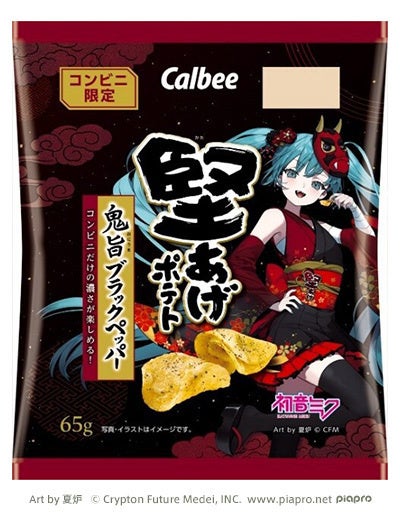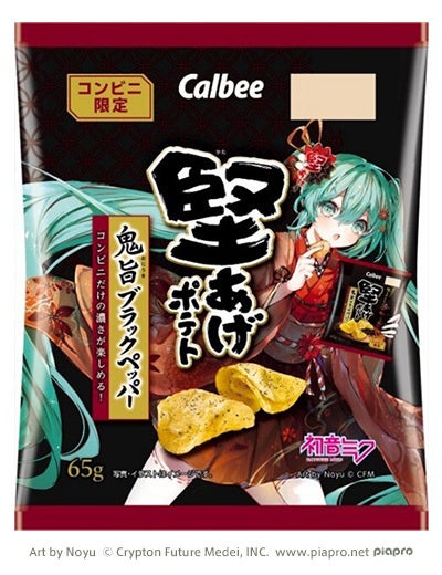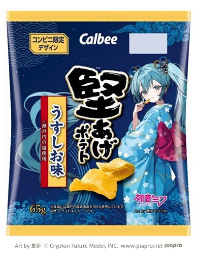 今回は「堅あげポテト」のデザインパッケージに、同じく北海道に縁のある日本発祥のバーチャルシンガーとして、初音ミクを起用していただくことになりました。デザインパッケージは「うすしお味」2種類、「鬼旨ブラックペッパー」2種類の全4種類です。各パッケージに印刷された初音ミクのビジュアルは、3名のイラストレーター(夏炉さん、はねことさん、Noyuさん)による描き下ろしで、それぞれ髪飾りや帯締めに「堅あげ」マークや「堅あげポテト」がポイントとして描き込まれています。