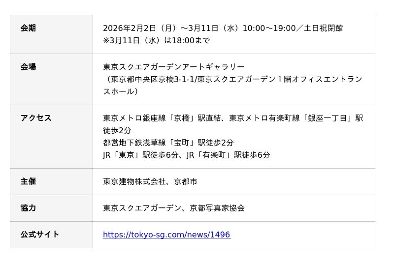 東京建物株式会社は、2026年2月2日(月)から3月11日(水)の期間、東京建物等が保有および管理する複合ビル「東京スクエアガーデン」(東京都中央区)1階オフィスエントランスホール内「東京スクエアガーデンアートギャラリー」にて、写真展「だれかのふるさとと出会う旅 03京都府写真展|京都西山はいいぞ!フォトコンテスト2025」を開催します。本展覧会では京都市が開催した「京都西山はいいぞ!フォトコンテスト2025」に入賞した作品を展示します。