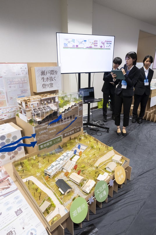 災害を見据えて、建築学、土木工学、都市計画学、農村計画学などによる既存の手法にとらわれずに、他の工学、芸術、文学、教育、文化財、医療、商業など、多様な分野の視点からとらえた地域資源と「繋」がり、自分の生き方を支える新しい空間デザインの可能性の提案が課題。