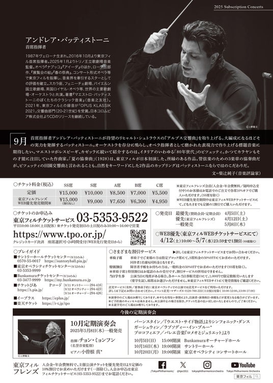 公益財団法人東京フィルハーモニー交響楽団(以下、東京フィル/所在地:東京都新宿区、理事長:三木谷浩史)は、2025シーズン下半期(6・7・9・10月)の定期演奏会 1回券の優先/WEB優先販売を一般発売日の5月8日(木)に先駆けて期間限定で販売中です。
