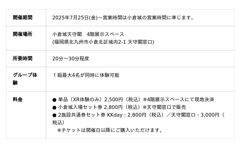 『XR脱出ゲーム~1837 小倉城 炎の天守閣から脱出せよ』を開発・製作し、7月25日(金)に開催することが決定いたしました。6つの謎を解決し、炎に包まれた小倉城から無事に脱出できるのかがイベントの要になっております。(本イベントLP:https://kokura-castle.jp/xr-escape-game/)